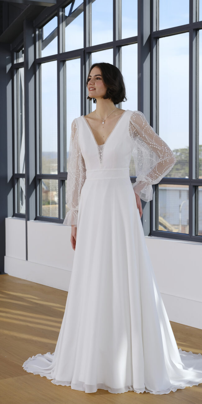Buste en broderie matte, larges bretelles pour un maintien optimal, décolleté en V. On retrouve les bretelles au niveau du dos. Jupe en mousseline avec une traîne.